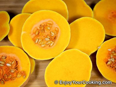 3. Then slice squash across into circular pieces about ¾ inch wide (or more or less, depending what kind of size you need for further cooking):