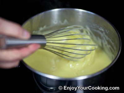 Put sauce pan on low heat burner and cook custard until it is thickened (10-15min), continue stir with whisk all the way till the end; then add vanilla sugar or vanilla extract to taste: