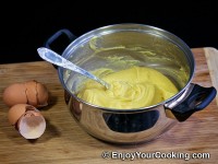 Mix egg yolks, sugar, vanilla and flourStir boiled milk inBring to heat and cook to needed thickness