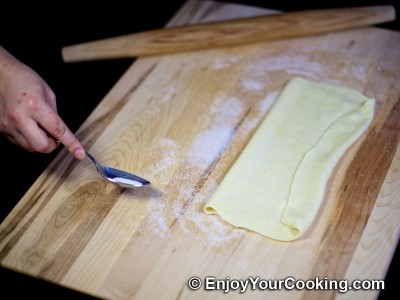 If you work in batches, slice pastry dough in pieces and store dough you don’t work with for current batch in a fridge; when slicing keep in mind that rectangular shape of dough is easier to work with in this recipe. Sprinkle wooden board with sugar (amount to taste, more sugar will make sweeter cookies):