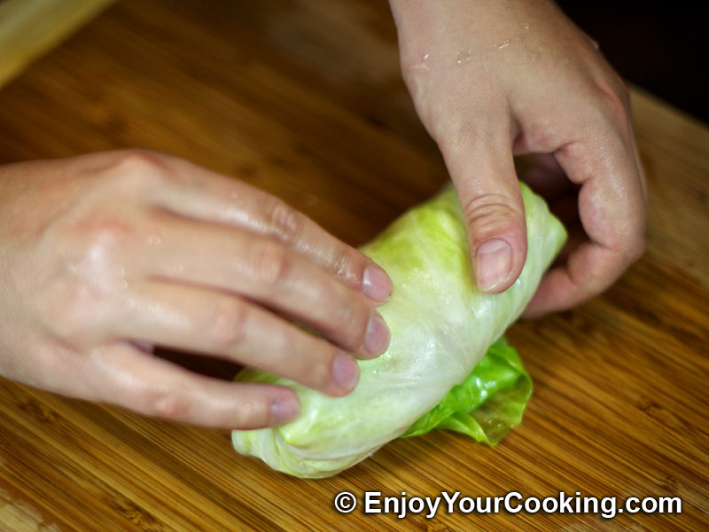 Separate a leaf from cabbage using knife Slice center hard part of the leaf offArrange a table spoon of stuffing at the steam side Roll it forwardFold left sideAnd right one Roll once moreAnd moreA cabbage roll is ready!