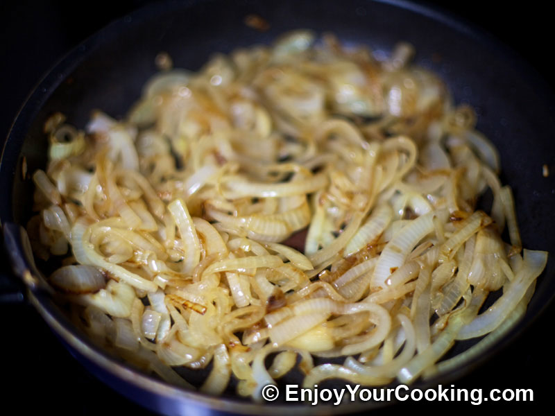 Now it is time to cook sour cream and onions sauce: warm up skillet with a bit of oil over moderate heat; peel remaining 2 onions, slice in half-circles and fry them over until yellowed in color, stir from time to time: