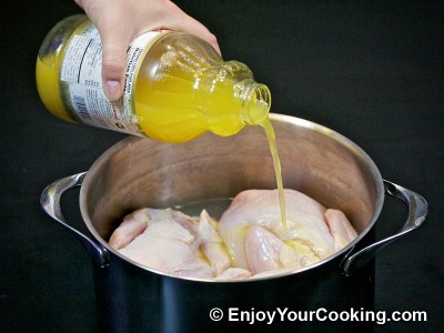 Warm up half cup of oil in a deep cooking pot (if you have cast irons one, use it) over moderate heat; add hens in: