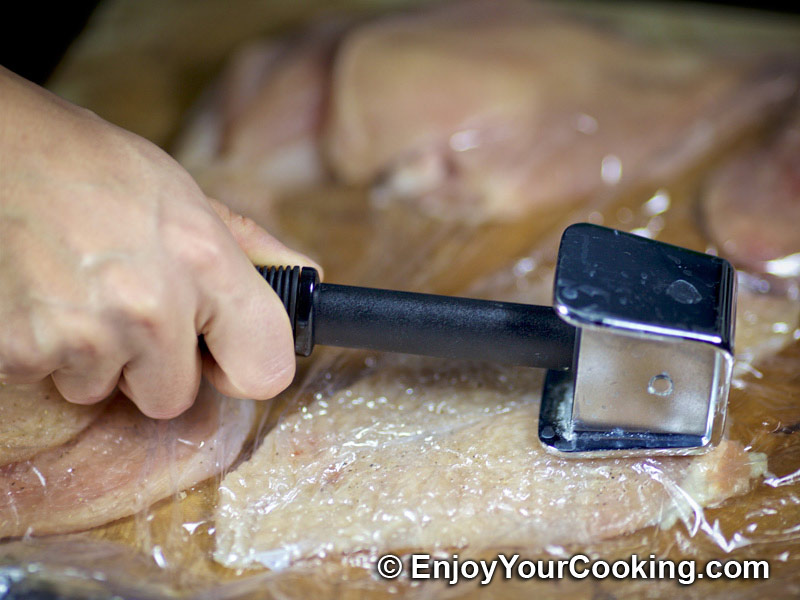 Them using meat tenderizer carefully beat and flatten each piece from both sides (if you beat meat through plastic food wrap folded in couple layers the process will be less messy):