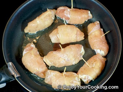 Warm up a skillet with a bit of oil to moderate high heat. Working in batches, move chicken pieces to the skillet, place each piece in a way that end of chicken roll is on the bottom: