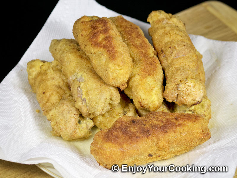 Repeat frying procedure for all pork rolls, move cooked rolls to a plate laid with paper towels to remove excess of oil. It is important to cook pork all the way through. So, if you are not sure your rolls are cooked all the way through (or if you rolled meat in several layers), move cooked rolls to a baking pan and put pan into the oven warmed up to 350F for 10-15 mins more to be on a save side: