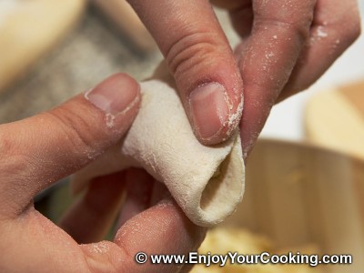 17. And by the way, often happen what you got some dough left when the filling is gone. Then you can choose to make some empty dumplings like the following, and just boil them with the rest (I loved those when I was a kid). To prepare those just get dough circle and pull opposite sides of it with your pointing finger and thumb towards each other until it forms a bow: