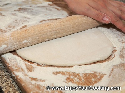7. Keep rolling dough from the middle to each side until it gets evenly very thin, if it is hard for you to get whole piece of dough thin – just do as thin as you can and then roll each “dough circle” once again before you fill it with cheese, just to make sure it is thin enough: