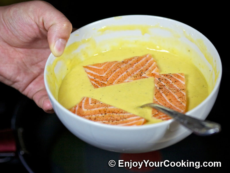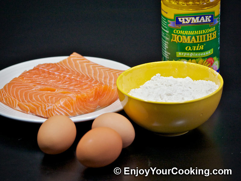 Salmon fried this way turns out juicy. All you need is salmon, eggs and flour to make batter. Amount of flour may vary – just add flour until batter gets desired thickness.