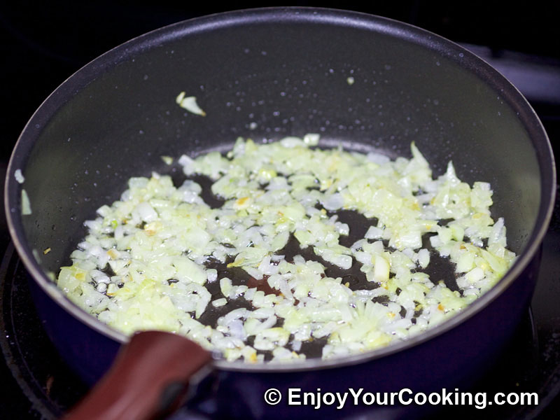 Warm up deep skillet with a bit of oil, peel and chop onions, add them to the skillet and fry over medium heat until softened and slightly colored, stir from time to time: