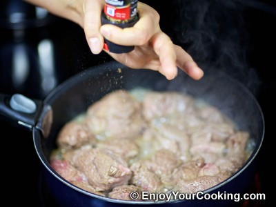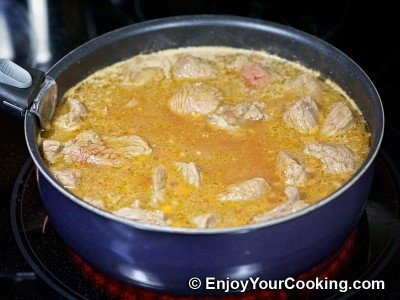 Mix everything good, bring all to boil then reduce heat to slow simmer, cover with lid and cook over slow simmering for 20-30 mins (or until meat is as soft as you like it):