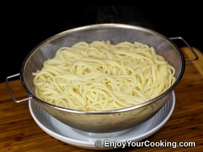 Don’t forget that different kinds of pasta require different time for cooking: check instructions on pasta package and adjust steps accordingly so both sauce and pasta are ready approximately in the same time.