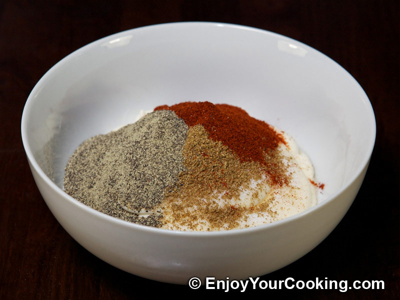 Peel garlic, press it into the bowl (you can also mince it in blender or slice): Pork Roast with Garlic, Mayo and Spices Recipe: Step 5
