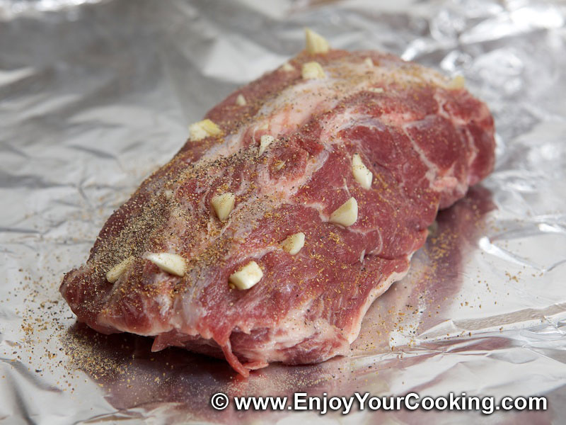 It takes about an hour to cook from beginning till end. It is very easy to prepare recipe. Apart of main ingredients, which are mainly pork and garlic, you will also need a sheet of cooking foil.