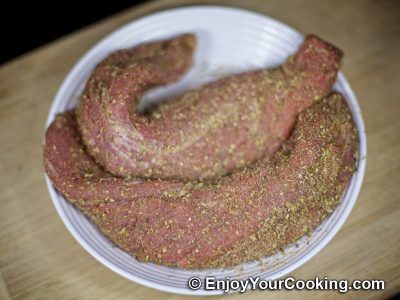 With dry hands rub the spices into tenderloins, pressing, so the seasoning sticks to the meat: