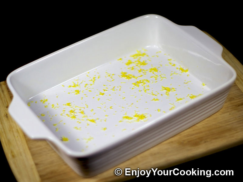 Warm oven up to 350F. Sprinkle remaining of lemon zest on bottom of a baking pan: