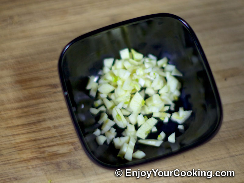 While pasta is cooking, let’s prepare sauce. For that warm up saucepan with 2-3 tablespoons of olive oil, don’t over heat. Add chopped garlic: