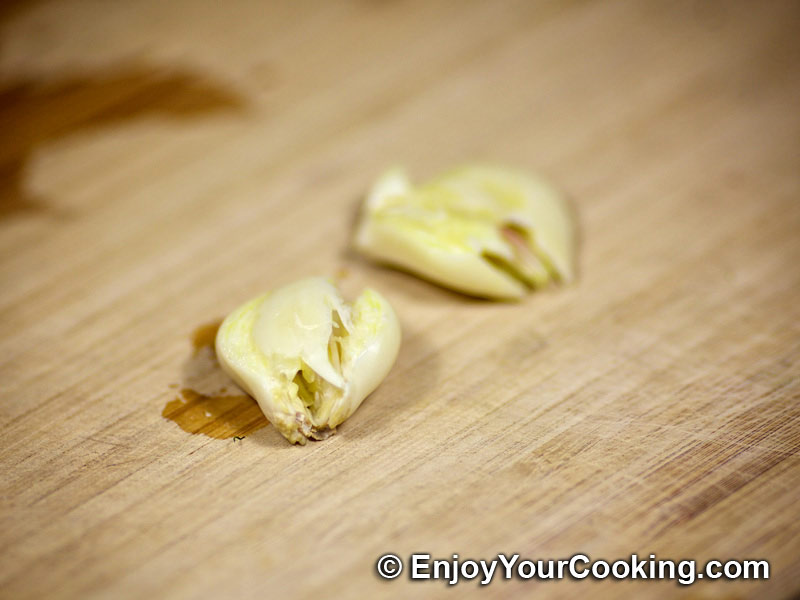 Peel garlic cloves, and flatten them with the flat side of the knife: