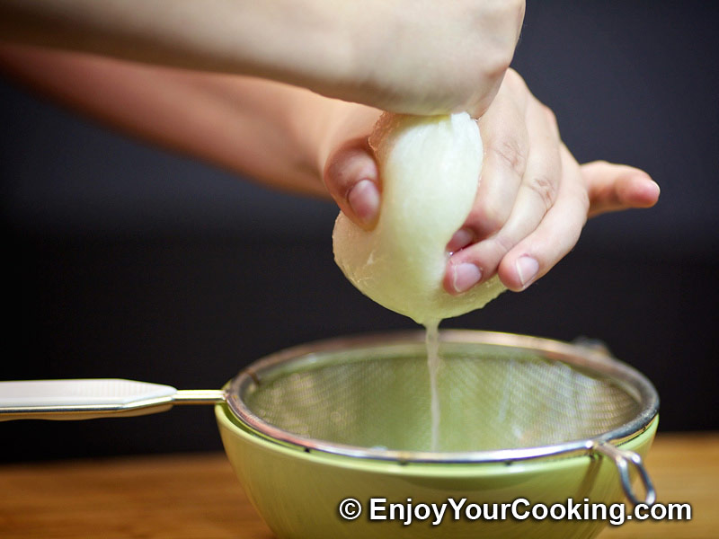 Set a colander in an appropriate size bowl; line colander with 2-3 layers of cheesecloth, put onions in and extract juices: