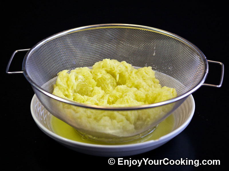 So, pour shredded zucchinis to colander and using spoon or hands try to squeeze juices out and discard them: