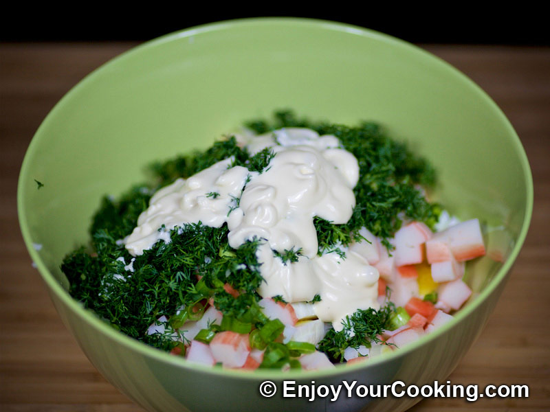 Unusual combination of crab stick, beans, eggs and greens, but very gentle taste I would say.