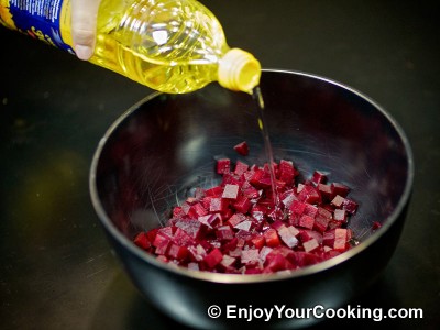 Dice beet, add to the deep bowl, pour over with sunflower oil and mix: