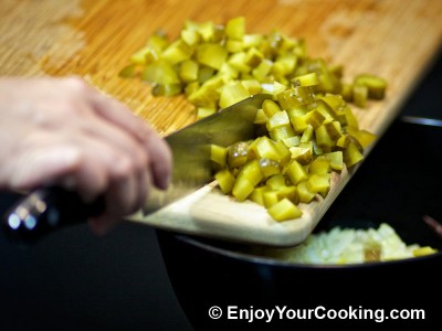 If sauerkraut is too sour or salted, rinse it with cold water, the squeeze liquid out, chop sauerkraut and add to the bowl:
