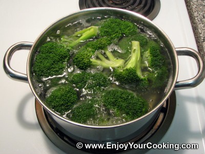 Fried Broccoli Recipe: Step 1 - Fill cooking pot with water and put it on the burner on moderate heat. When water begin to boil put broccoli to the pot and after water begins to boil again correct the heat. Make sure water isn’t bubbling too active, that may make broccoli to soft. Let it boil for about 10 minutes: