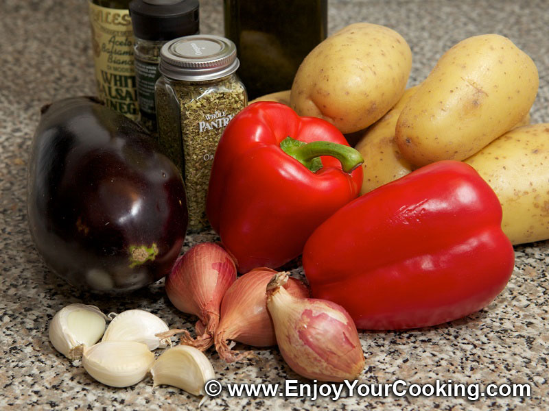 Bell peppers, eggplants, potatoes roast together with olive oil based dressing with garlic and herbs can be a perfect dish on their own as well as a side dish to meats or poultry.
