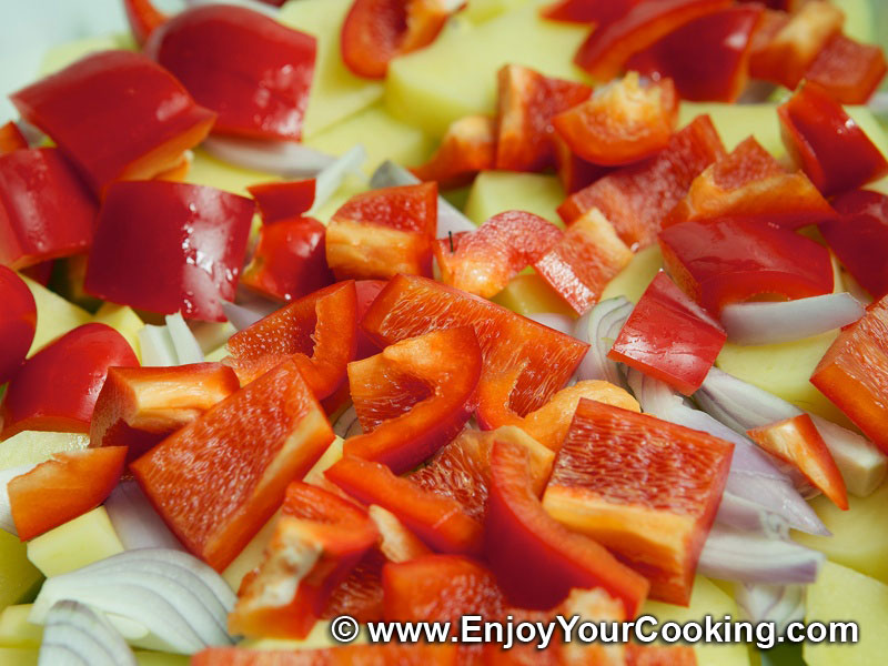Prepare ingredients: as you can see on the pictures below, baking pan I used wasn’t big enough for amount ingredients I had — it was hard for me to stir vegetables in it. Stirring is easier to do if baking pan is bigger or/and its sides are higher than content for at least 1 inch — so adjust amount of ingredients if you have the same baking pan or use bigger one: