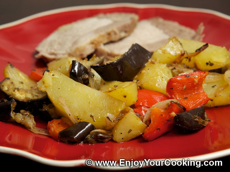 Potato roast with vegetables can be served alone as a no-meat main course or as a side for meat of poultry dish of your choice. This time I served them with a pork roast: