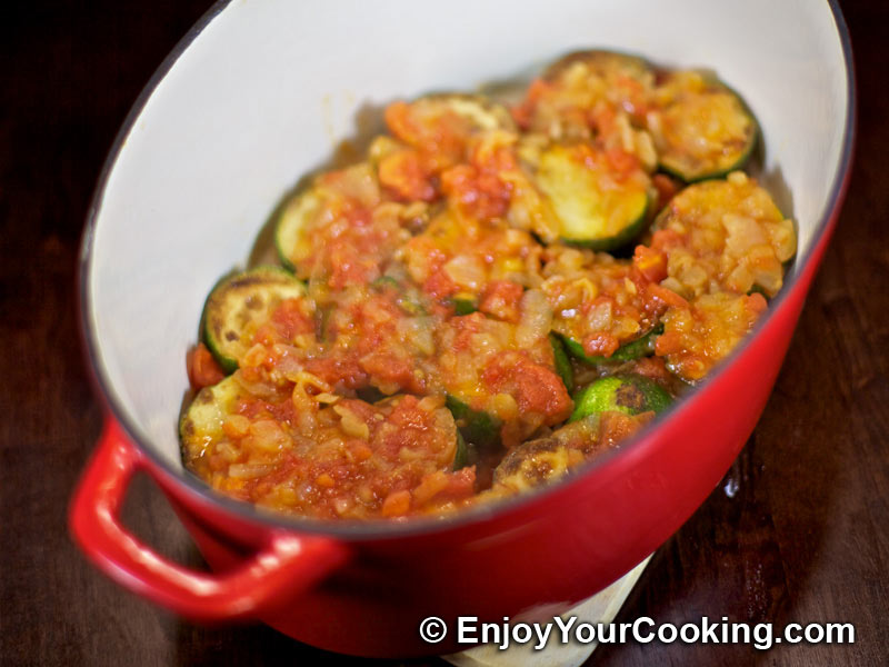 Move browned zucchini pieces to pot with thick sides (cast-iron one, dutch oven, or so) and arrange them in 1 layer: