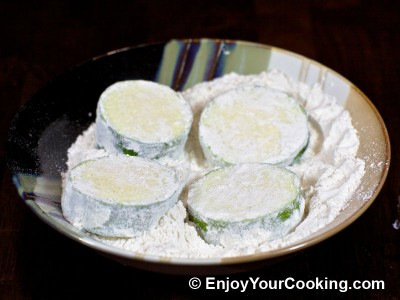 When zucchini are ready from one side, flip them to other one and fry until the same color: