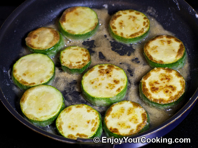 Continue frying rest of zuchinni (dipped into flour) from both sides and move cooked pieces to the pot to arrange second layer (or more):