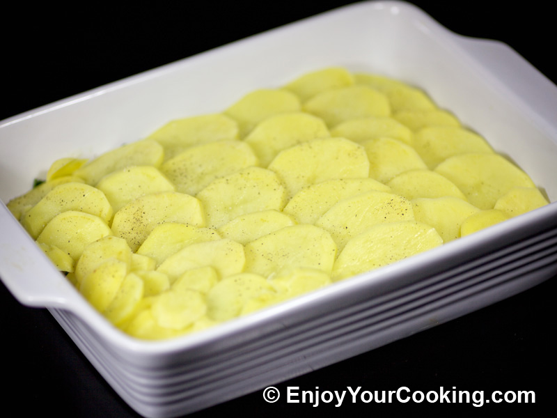 Spread a bit of sauce on the bottom of the baking pan and layer half of all potato slices in it: