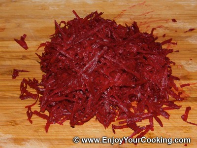Skin a beet root, grate it on big slots or slice into stripes whatever you prefer: