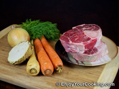 All you need is beef with bones (I find shank cut very suitable for soups and broths), roots (carrots, parsley, celery), onion, fresh greens and this recipe.